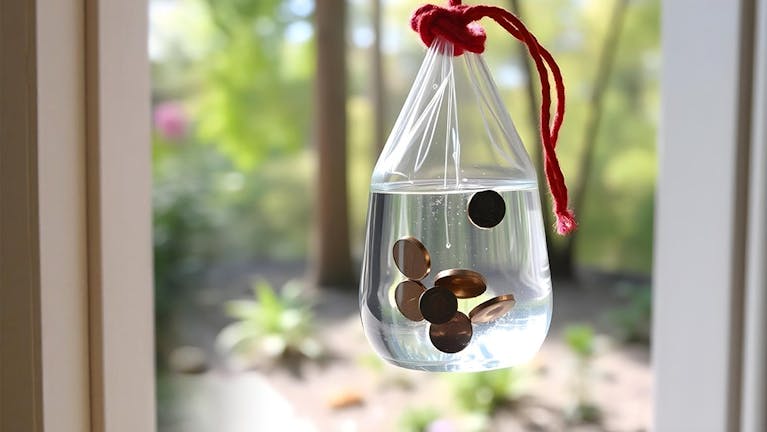 Proponents of this DIY fly repellent believe it works because of how flies perceive light. Flies have compound eyes, which are very sensitive to changes in light. When light hits the water-filled bag with shiny pennies or aluminum foil, it refracts and confuses the flies, causing them to move away.